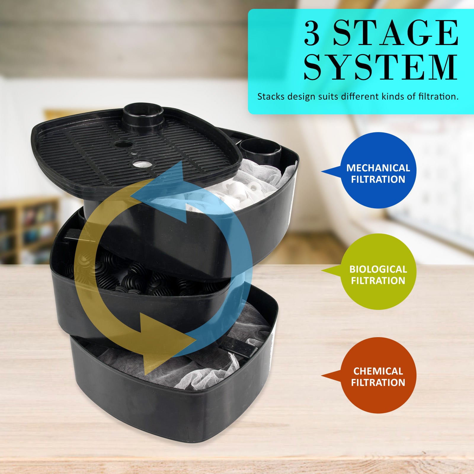 The amazing multi-level filter is capable of offering you the best filtration system as it can hold large quantities of mechanical, biological and chemical filtering materials! The 4 filtration baskets comes with handy handles and allow you to make many different filtering combinations, hence, they give you more flexibility and control over the quality of the water of your tank. The ideal filtering materials are ceramic noodles, bio balls and carbon.